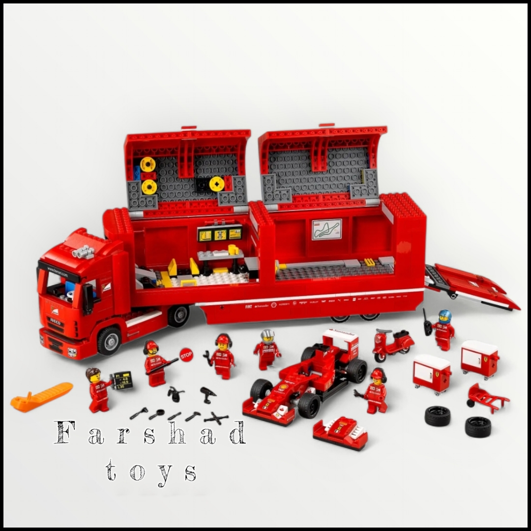 کامیون فراری اسکودریا دارای کابین راننده با سقف بازشو و ۲ صندلی برای مینیفیگورها، تریلر جداشدنی با سقف و کنارههای بازشو برای بازی آسان، پایههای ایستاده اهرمی و دریچه/رمپ عقب جمعشونده، قابلیت شروع حرکت با ماشین F1، اسکوتر، مجموعه کامل ابزار (شامل مته برقی، قوطی روغن، پیچگوشتی، آچار، چکش، آچار ضربدری، آچار بسته، آچار باز و آچار سوکت)، صفحه نمایش کامپیوتر، ۲ جعبه ابزار، جایزه، لیوان قهوه و فضای ذخیرهسازی برای تمام لوازم جانبی است.