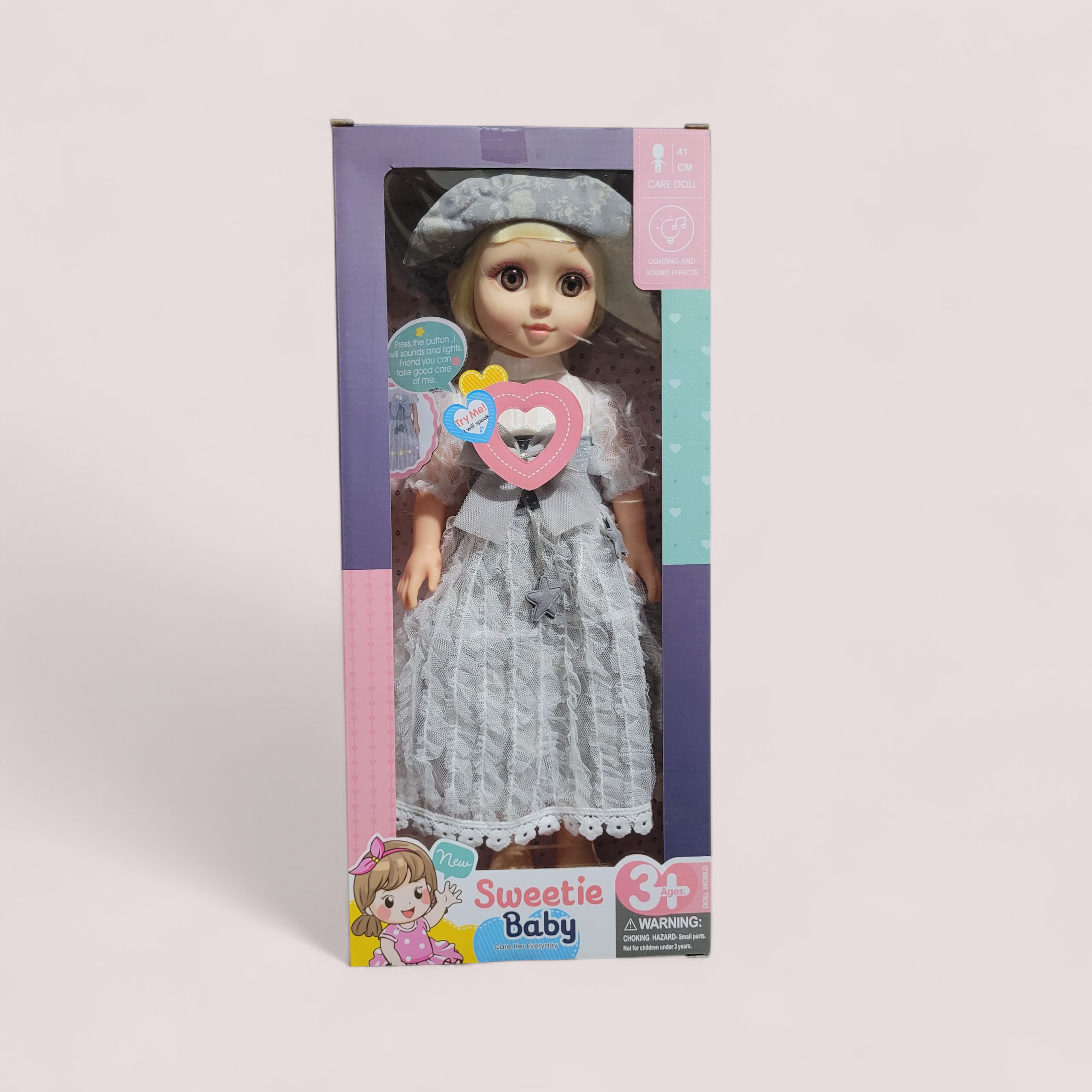عروسک شیرین کوچولو با لباسهای شیک. دکمه جلوی عروسک را فشار دهید، صدا و نور پخش میکند و توجه کودکان را جلب میکند. آنها دوستان بچهها هستند.
